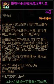 DNF精灵之泉守卫战活动快上线了,参加活动就可以获得一些奖励,比如哥布林王高格变装玩具,那么DNF哥布林王高格变装玩具有什么用?下面就给大家带来DNF哥布林王高格变装玩具介绍。