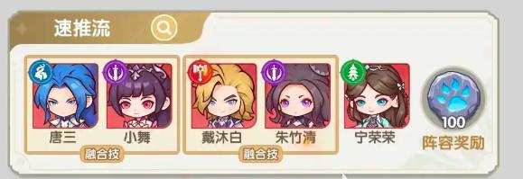 在速推流当中推荐唐三搭配小舞、戴沐白、朱竹清、宁荣荣。其中唐三为主控,小舞为爆发输出,戴沐白为破甲,且戴沐白搭配朱竹清可使用融合技能,而宁荣荣作为加速辅助。这个组合在主线推图和材料副本当中有着非常不错的表现,新手伙伴们可以考虑使用。